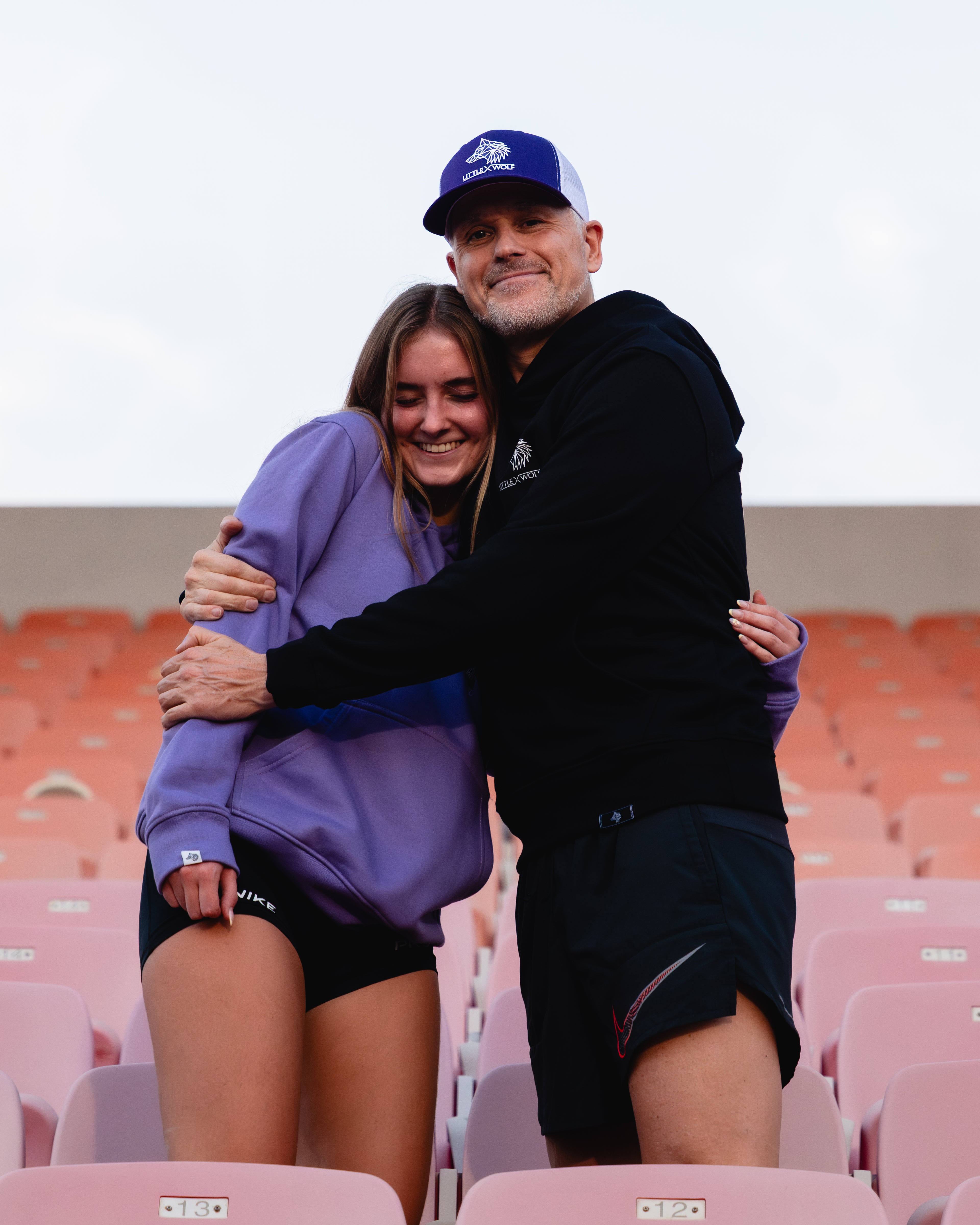 Two people wearing purple and black hoodies with visible branding, standing outdoors.